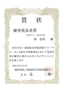 弊社からは調査部の原部長が、 「道路災害における地すべり応急対策について」と題して 技術発表をされ、優秀発表者賞を受賞されました。 おめでとうございます! 18日には、島根県西部地震により崩壊の発生した、小弁堂地区の山腹工事の現場や 三瓶小豆原埋没林公園の現地見学を行いました。